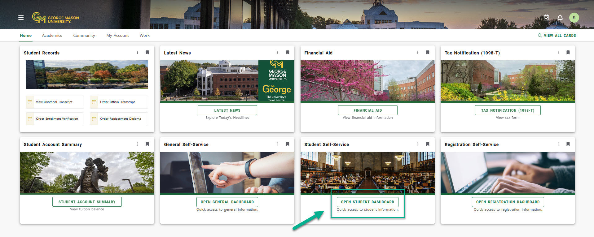 Log into Patriot Web (https://patriotweb.gmu.edu), then click on Open Student Dashboard link under the Student Self Service card: